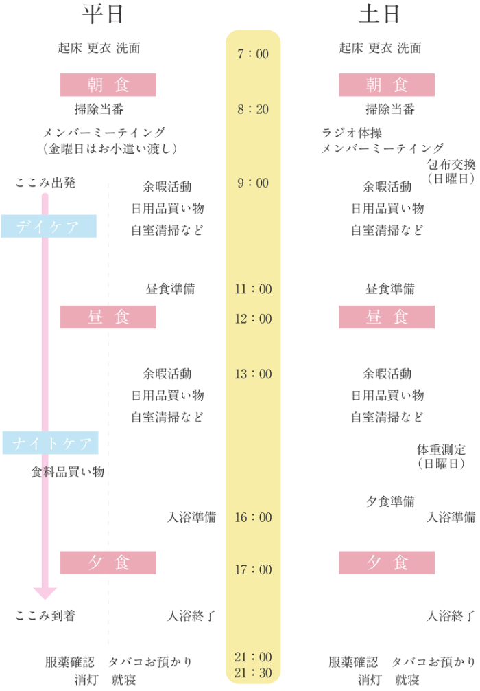 【ここみ】では入居者の皆さまに、平日は病院でのデイ・ナイトケアや福祉サービス事業所などを利用していただくことができます。